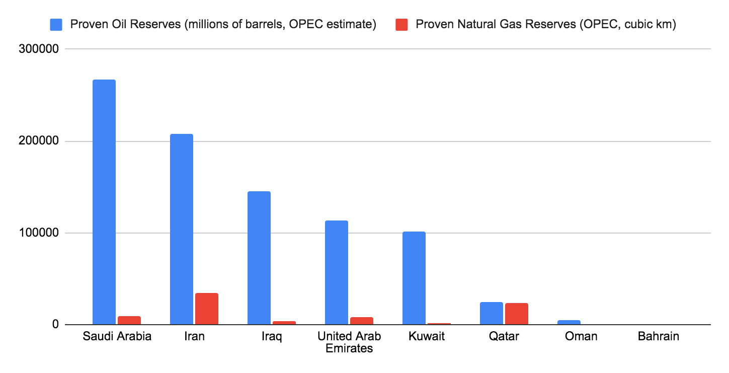 This chart shows estimated reserves, not current production. In terms of current production, Saudi Arabia produces more than 2.5 times as much oil as Iran. Iran, Iraq, and the UAE all produce roughly the same amount of oil as one another. Iran produces more than twice as much natural gas as Saudi Arabia, but both are dwarfed by the gas production of the US and Russia. Qatar is the second largest gas producer in the Gulf. Other Arab states, even Algeria and Libya, produce far less energy than those in the Gulf. Only Bahrain and Oman are not major energy producers (though even then, they are per capita).
