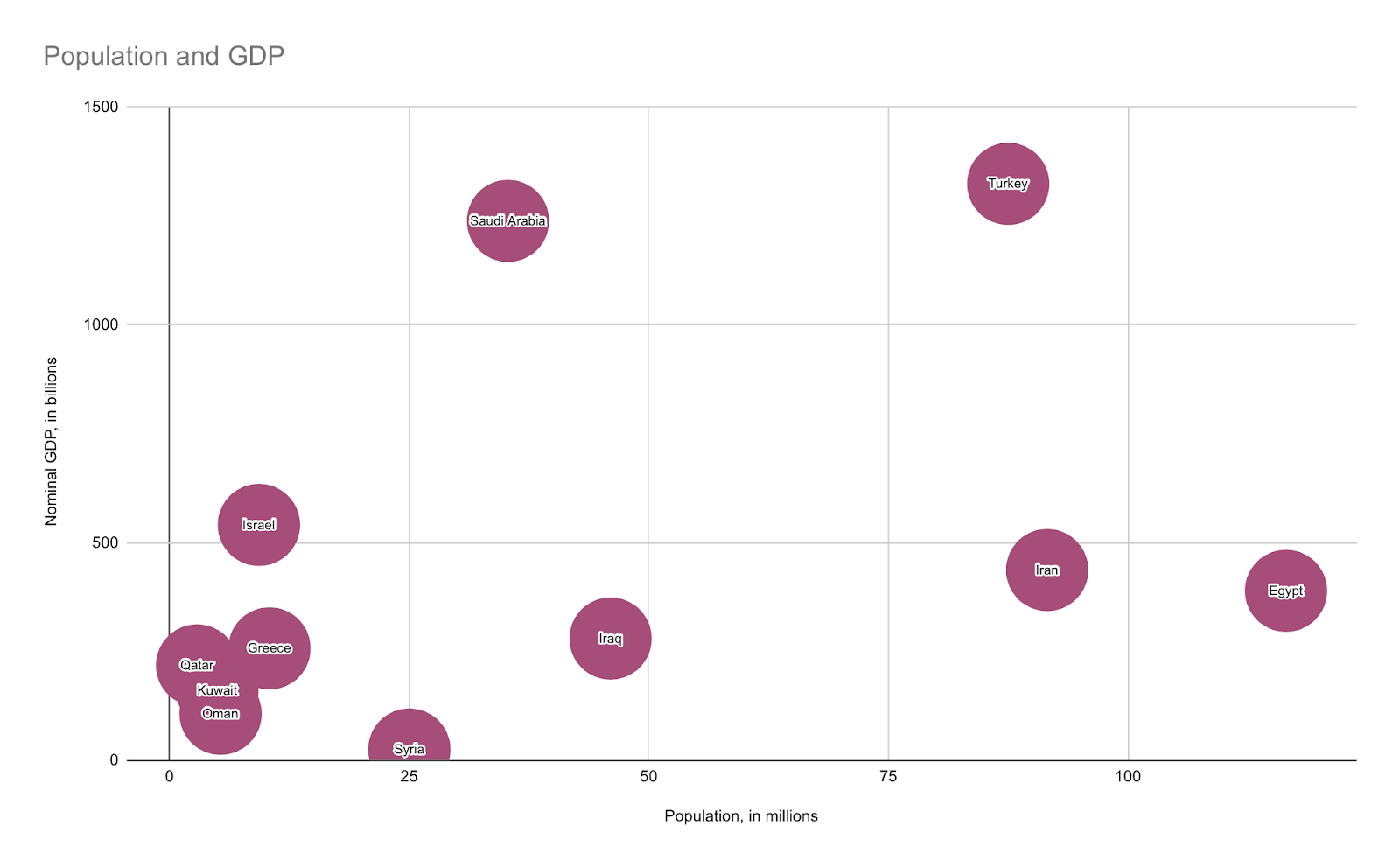 *These figures include non-citizen residents in the Gulf countries, but do not include the non-citizen Palestinian populations in the West Bank and Gaza – approximately 5.3 million people – as part of Israel’s population. The UAE’s label on this chart is obscured by Israel’s, as they have about the same GDP and population size as one another. Turkey has the highest GDP of all Muslim-majority countries, ranking just ahead of Indonesia and Saudi Arabia.