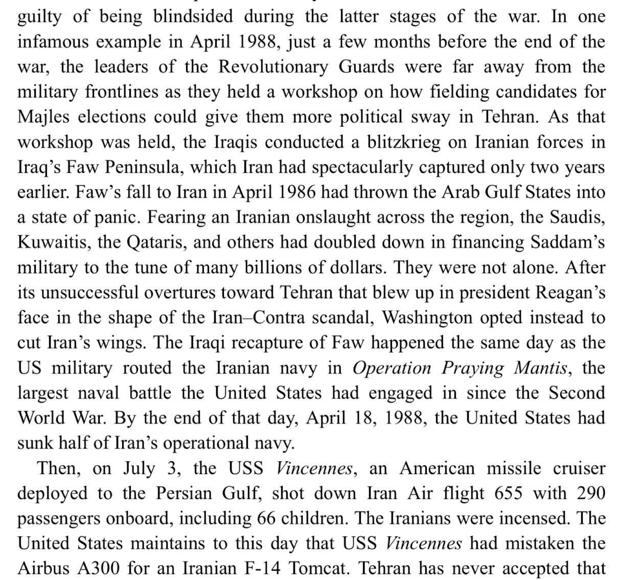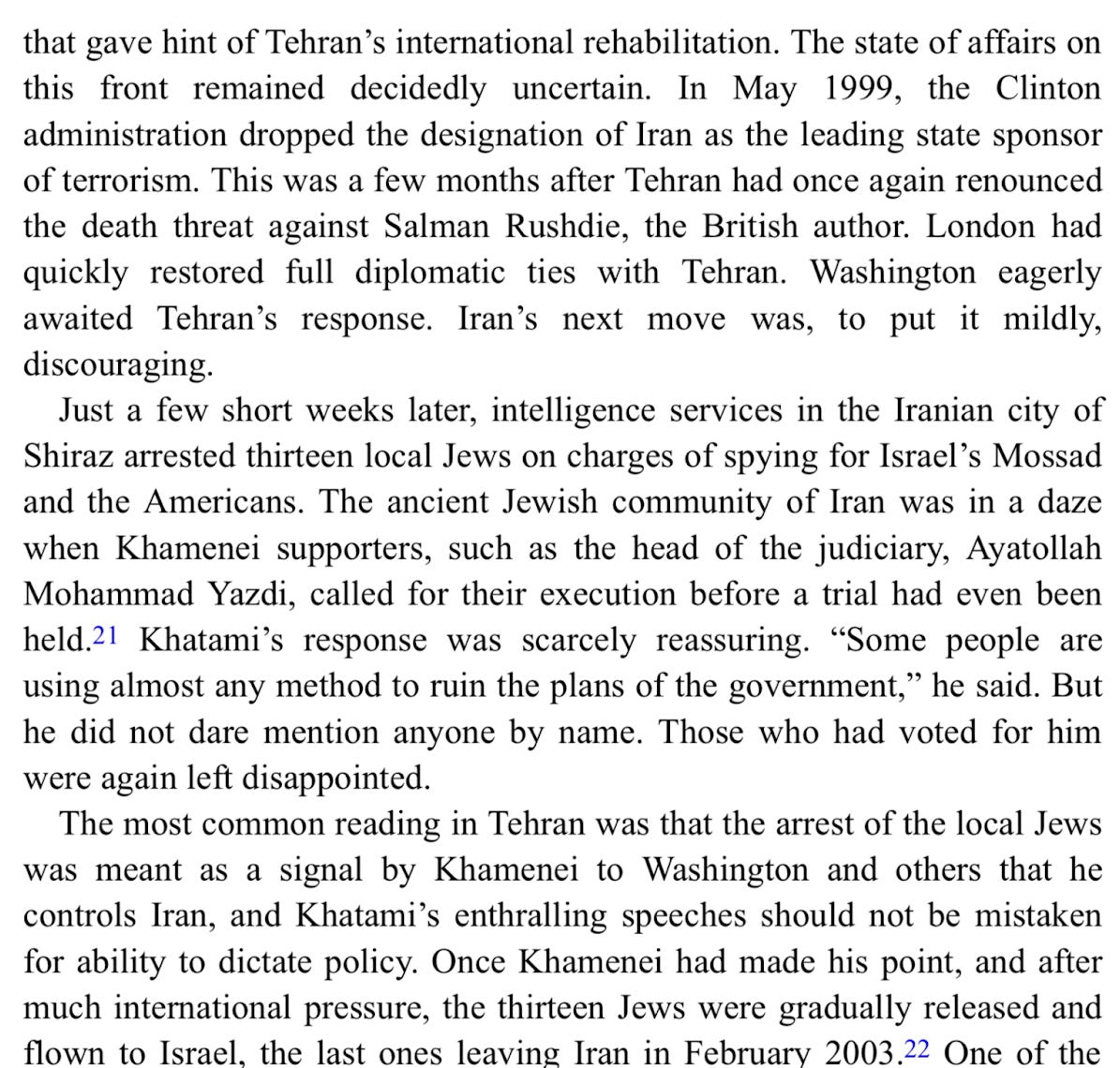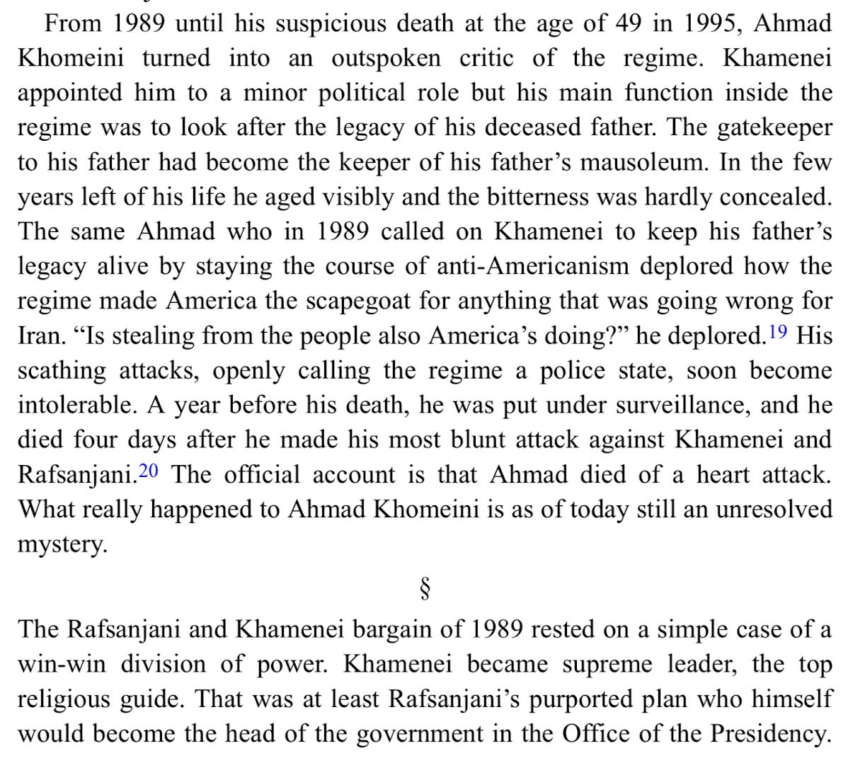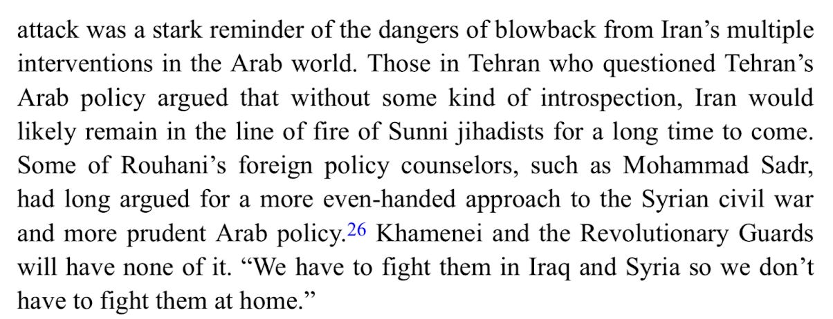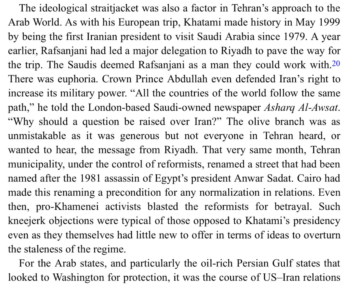 Meanwhile, in the Iraqi Kurdish civil war (1994-1998), Iran switched sides in 1995, going from supporting the KDP, which was backed by Baghdad, to the PUK, which was favoured by the US. More generally, there was a thaw in relations, and quiet cooperation, between Iran and the US, until they became direct rivals of one another in post-Saddam Iraq and the Middle East at large after 2003. (The twin events of Aug 7-8, 1998 would have an echo three years later, when al Qaeda assassinated Afghanistan’s leading Tajik figure, Iran and India’s ally Ahmad Shah Massoud, two days before 9-11). US-Iranian interests might be realigning again now, with Iran and its allies weakened by Israel, the Taliban back in power in Afghanistan (though so far cooperating with Iran, for the most part), and the US and Europeans looking for allies against Russia. - From Alex Vatanka’s excellent book The Battle of the Ayatollah’s in Iran (which covers Iranian politics since 1979 through the lens of the relationship between Khamenei and Rafsanjani):