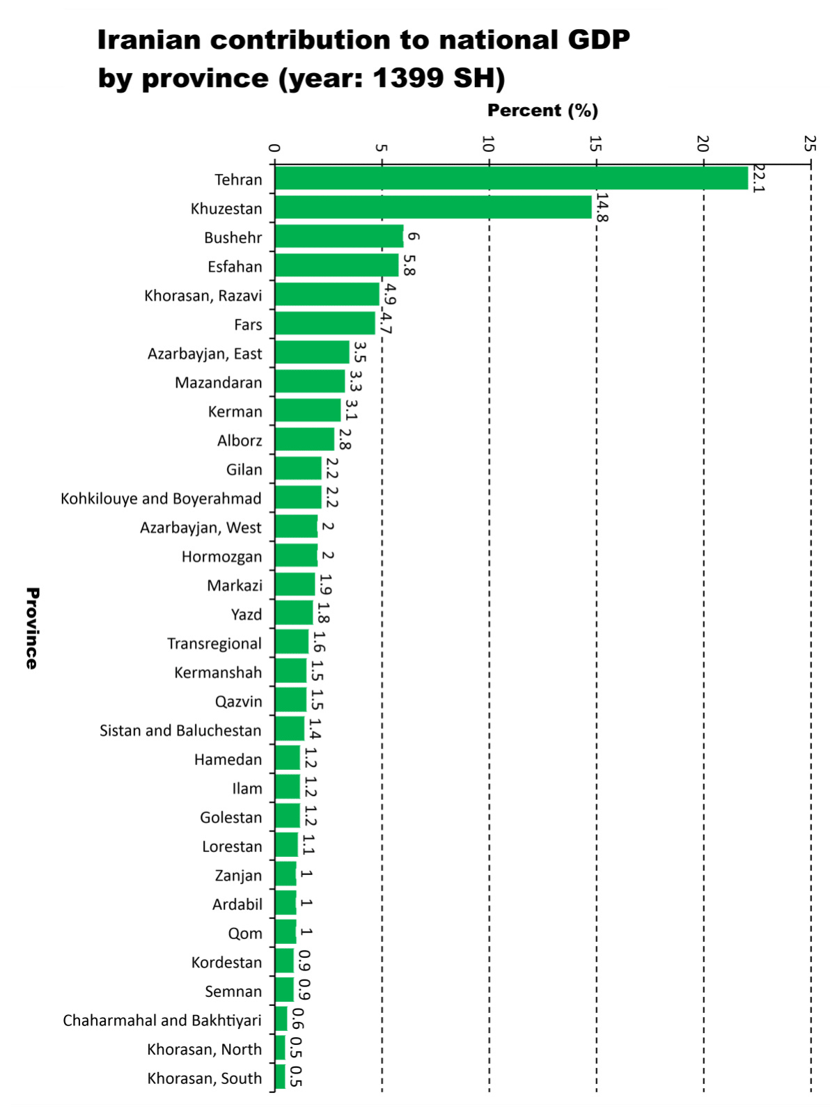 Source: Wikipedia, from the year 2020 (1399 in Iran’s calendar). Apart from Tehran, the capital and largest province by far (approximately 13.5 million inhabitants in 2020), the largest GDP contributor is the Gulf province, Khuzestan (with 4-5 million people, perhaps 30-50 percent of whom are Arabs, the rest split between other minorities and Persians). The next largest, Bushehr (pop. 1-2 million) is also on the Gulf.