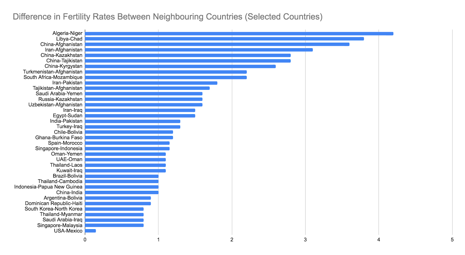 The drop in Iran’s fertility rate stands out even more when viewed alongside some of its next-door neighbours, where, apart from Turkey, Armenia, and Azerbaijan, fertility rates remain higher than almost anywhere outside of Sub-Saharan Africa. Iraq, Pakistan, and Afghanistan especially have high fertility rates; the discrepancy between these countries and Iran is among the highest that exists between any neighbouring states in the world: