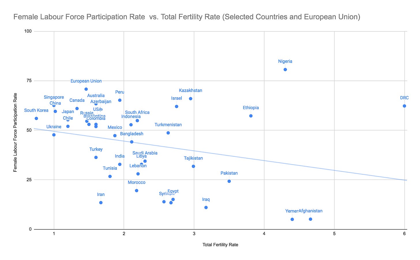 In most countries, fertility rates and female labour force participation are negatively correlated. In Afghanistan for example women tend to have lots of children but do not usually participate in the labour force, whereas in the European Union most women are in the labour force but do not have many children. There are two main exceptions to this pattern: the Islamic Republic of Iran, where women neither participate in the labour force (at least, not officially) nor have many children, and certain countries in Sub-Saharan Africa, where most women participate in the labour force and yet still have large numbers of children. (In Israel, Ultra-Orthodox Jewish women also have high labour force participation and large numbers of children). This might suggest that Iran could experience a rapid increase in its female labour force participation.