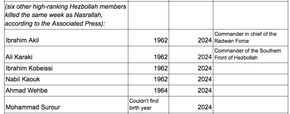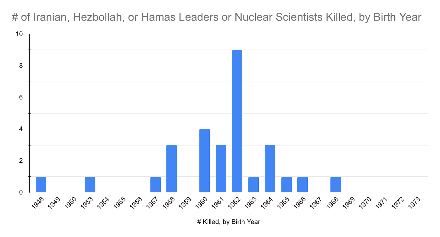 This chart includes seventeen Iranians (all killed since 2024, except for Qasem Soleimani, who the US assassinated in 2020), ten Hezbollah leaders, and three Hamas leaders (Yahya Sinwar, Mohammad Deif, and Ismail Haniyeh). There are an additional 20 Iranians listed below whose birth years I could not find. Of the 30 on this chart whose birth years were available, more than half were born in 1960, 1961, or 1962, and more than three-quarters were born between 1958-1964. These are only the prominent targeted figures in Iran I was able to find from news reports (and I included all the names I could find, regardless of their birth year). There might be many more that I missed, which could either negate or further emphasize this pattern. Iran claims there were approximately 1000 deaths of Iranians from Israeli strikes; Lebanon claims approximately 4000 deaths of civilians or Hezbollah members since Oct. 7th, 2023.