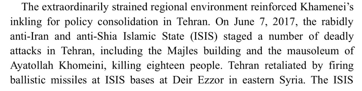 According to Kyle Orton, “the aftermath of the 2018 Ahvaz attack was quite similar to what happened after the Shah Cheragh attack in 2022, in terms of the doubt that the Islamic State was really responsible, and the waters were muddied further when the separatist Arab Struggle Movement for the Liberation of Ahwaz initially took responsibility, only to repudiate the claim soon after…The only other Islamic State attack there has been in Iran was on 7 June 2017, when two Islamic State suicide bombers blew themselves up at the mausoleum of Ayatollah Ruhollah Khomeini [in Tehran], and gunmen shot up the nearby Majles (parliament). The twin attacks killed at least twelve people and wounded forty-two.” (Those 2017 terror attacks occurred a day after the beginning of the crisis between the Saudis and Qataris–the latter backed by Turkey and Iran–and two days before the destruction of the Great Mosque of al-Nuri, where, among other things, the Islamic State declared their caliphate in 2014, during Iraq’s Battle of Mosul).