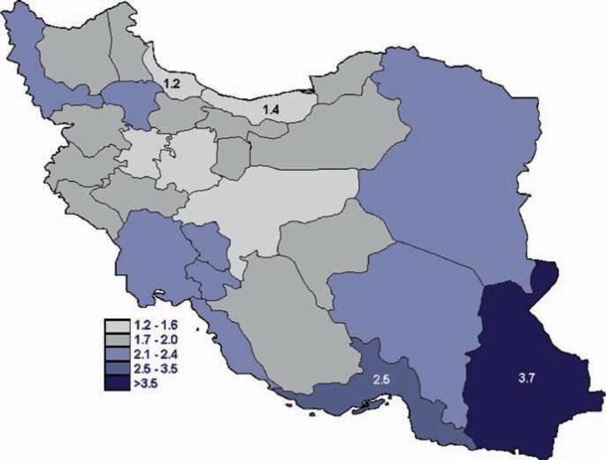 Iran, fertility rate by province. In Sistan-Baluchistan in the southeast (population 3-4 million),fertility rates are closer to those in Pakistan and Afghanistan than to the rest of Iran. An estimated 15 million Balochis live across Iran, Pakistan, and Afghanistan, with most living in Pakistan and perhaps one-third living in Iran