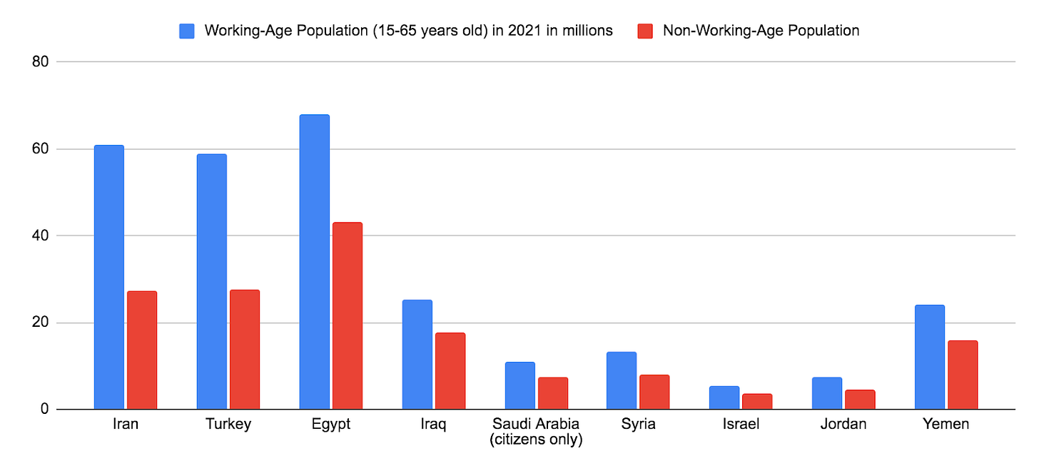 Iran and Turkey have more mature populations than countries like Egypt or Iraq, where large segments of the population are children. An estimated 69.8% of Iran’s population is between 15-65 years old. That is the highest in the world among major countries: the 22 countries that rank ahead of Iran in this regard have a combined population that is smaller than Iran’s own. Iran has the 16th largest working-age population in the world, but because it has extremely low female employment, it has only the 24th largest workforce.