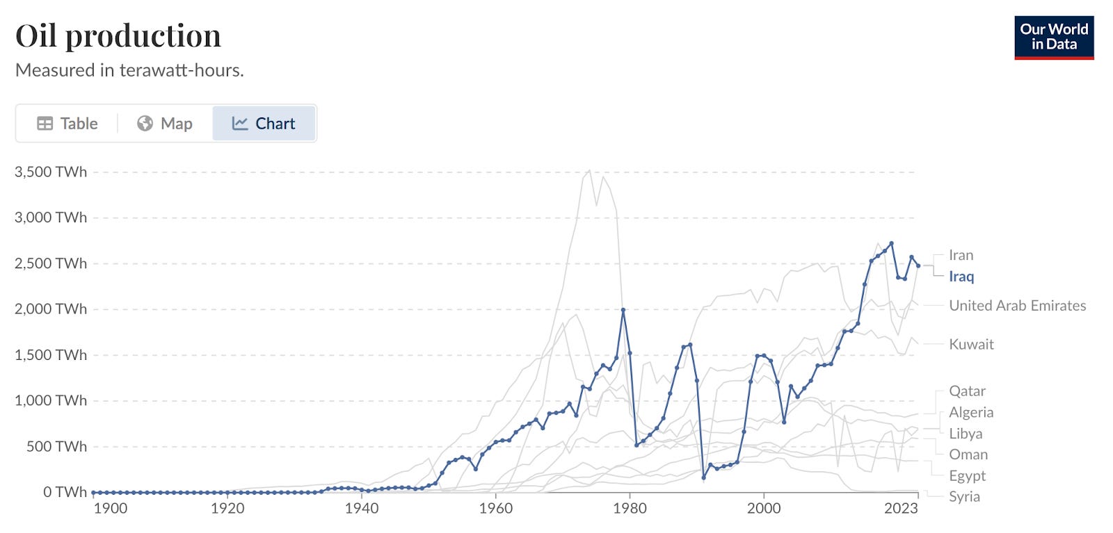 Oil production, US and Mideast countries (ex. North Africa) in twh, select years; Our World in Data