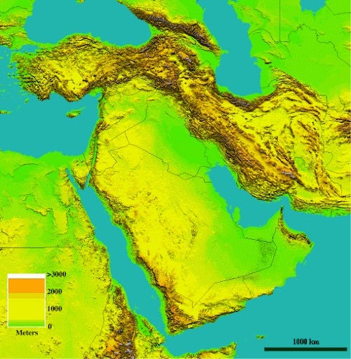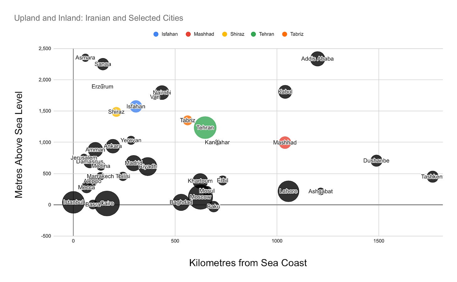 Cities in Iran, the Middle East, and nearby regions; circle size indicates population size. Most of Tehran is between approximately 1100-1600 metres above sea level, as are Iran’s other largest cities. No other cities of Tehran’s size are similar to it in both distance above sea level and distance inland. (There are however a few major cities, like Addis Ababa, that are even higher up and further inland). The elevation mitigates summer heat and increases precipitation. For example, whereas Baghdad–which compared to Tehran is a similar distance inland, but is only 35 metres above sea level–suffers average daily highs of 45 degrees C in its hottest month, and has nightly lows of 4 C in its coldest month, Tehran has average highs of 33-36 C in its hottest month, but nightly lows of -1 in its coldest. And whereas Baghdad gets ~6 inches of rain on average during the year, Tehran gets ~9-17 inches of precipitation (including snow) on average. The ring of mountains surrounding Tehran has however contributed to its having extreme air pollution.