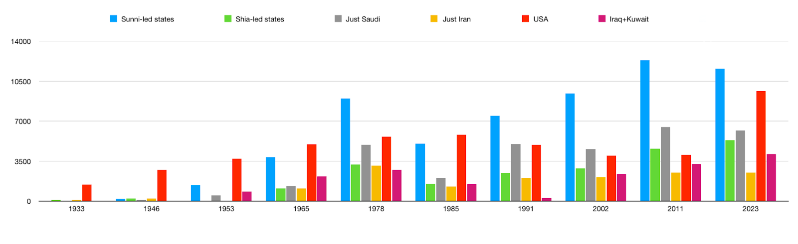 - In 1965, the US remained far ahead, but the Sunni-led states (which included both the Gulf Arab monarchies and Ba’athist Iraq), if taken as a whole, were catching up to it