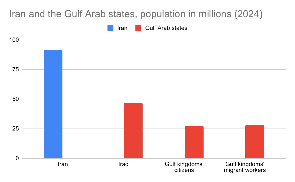 The eight Gulf countries: Iran, Iraq, Saudi Arabia, Oman, United Arab Emirates, Kuwait, Qatar, and Bahrain. In Saudi Arabia and Oman, non-citizen residents are about 40% of the population, compared to an average of more than 70% across the other four kingdoms