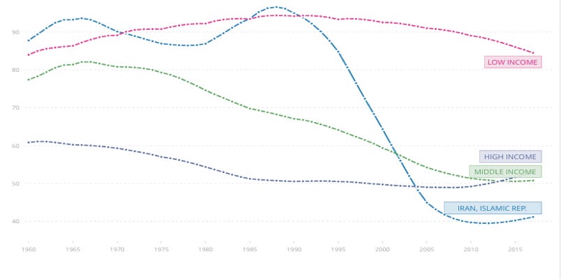 The graph below, from the World Bank, is of the ‘age dependency ratio‘, the ratio between a country’s working age population (defined as 15-65 years old) and its dependents (defined as anyone under 15 or over 65 years old). As recently as 1990 Iran had a dependency ratio as high as the average among “low-income” countries. Because of Iran’s rapidly falling birth rate, its dependency ratio has since dropped below the average among low-, medium-, and high-income countries.