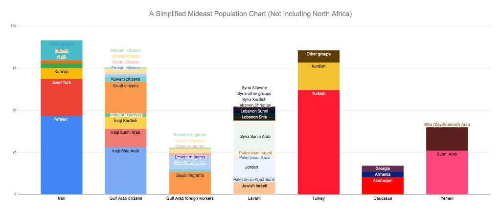 This chart should be taken with a large grain of salt, for a number of reasons. First, because the available statistics for sub-national groups often range widely and may be inaccurate. Estimates for Iraq’s Shia population range from 50-70% of Iraq’s total population, and it’s not certain that even this range is correct. Second, because there aren’t always sharp dividing lines between groups. In Iran, for example, the large Azeri Turkic minority is well-integrated into the Persian mainstream, and intermarriage between the two groups is common. (Supreme Leader Khamenei has mixed Azeri-Persian parentage). The significance of the region’s Sunni-Shia divide, similarly, although very real, is often overstated. Third, there are often important differences existing within groups. For example, Iraqi Kurds are usually listed as a single group, but they speak at least two main Kurdish languages that are not generally thought to be mutually intelligible with one another.*